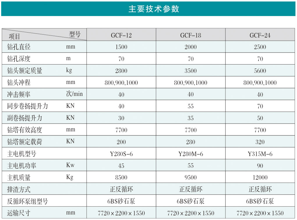 主要參數(shù)選擇合理、可滿足大口徑鉆孔的需要;純機械傳動、結(jié)構(gòu)簡單、緊湊、布局合理、操作方便可靠;標準化、通用化程度高,維修方便;沖擊鉆頭質(zhì)量大,形成巨大沖擊功,產(chǎn)生良好的破巖效果;采用同步卷揚機構(gòu),提拉鉆頭的兩根鋼絲繩能嚴格同步;采用壓梁沖擊實現(xiàn)鉆頭起落,工作穩(wěn)定可靠;可采用反循環(huán)工藝,排渣效率高。